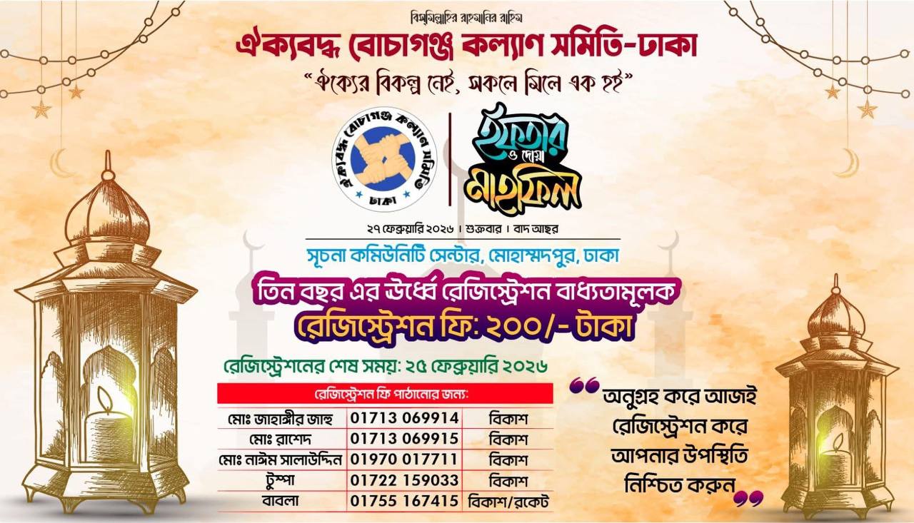 ঐক্যবদ্ধ বোচাগঞ্জ কল্যান সমিতির উদ্যোগে অনুষ্ঠিতব্য আসন্ন ইফতার মাহফিল সফল ও সুন্দরভাবে সম্পন্ন করার লক্ষ্যে আপনাদের স্বেচ্ছায় অনুদান আন্তরিকভাবে কাম্য।